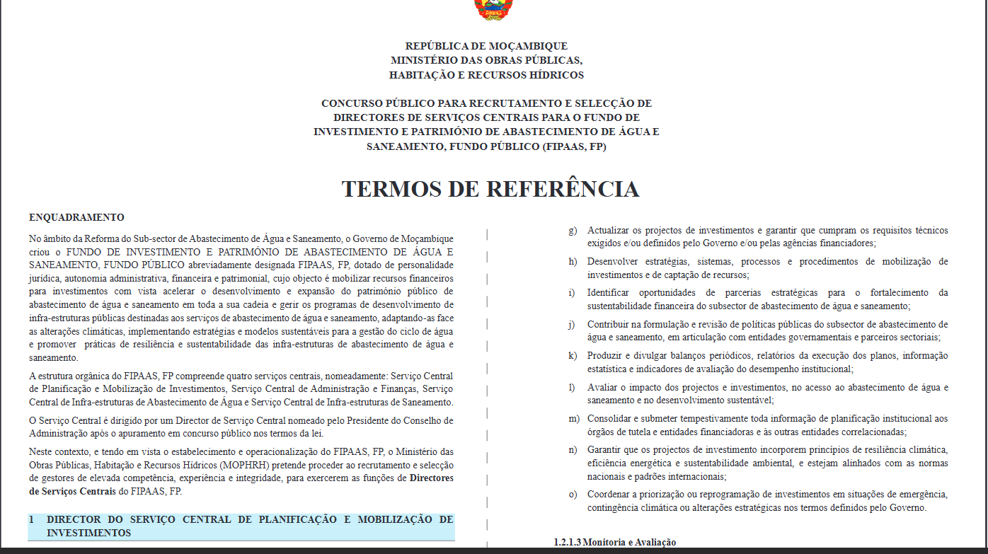 CONCURSO PUBLICO PARA RECRUTAMENTO E SELECÇÃO DE DIRECTORES DE SERVIÇOS CENTRAIS PARA O FUNDO DE INVESTIMENTO E PATRIMÓNIO DE ABASTECIMENTO DE ÁGUA E SANEAMENTO, FUNDO PÚBLICO (FIPAAS, FP)