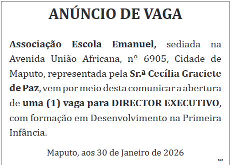 Associaçao Escola Emanuel, sediada na Avenida União Africana, nº 6905, Cidade de Maputo, representada pela Sr.ª Cecília Graciete de Paz, vem por meio desta comunicar a abertura de uma (1) vaga para DIRECTOR EXECUTIVO, com formação em Desenvolvimento na Primeira Infância.
