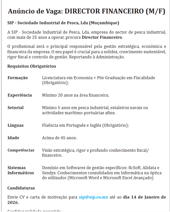 Envie CV e carta de motivação para sip@sip.co.mz até ao dia 14 de Janeiro de