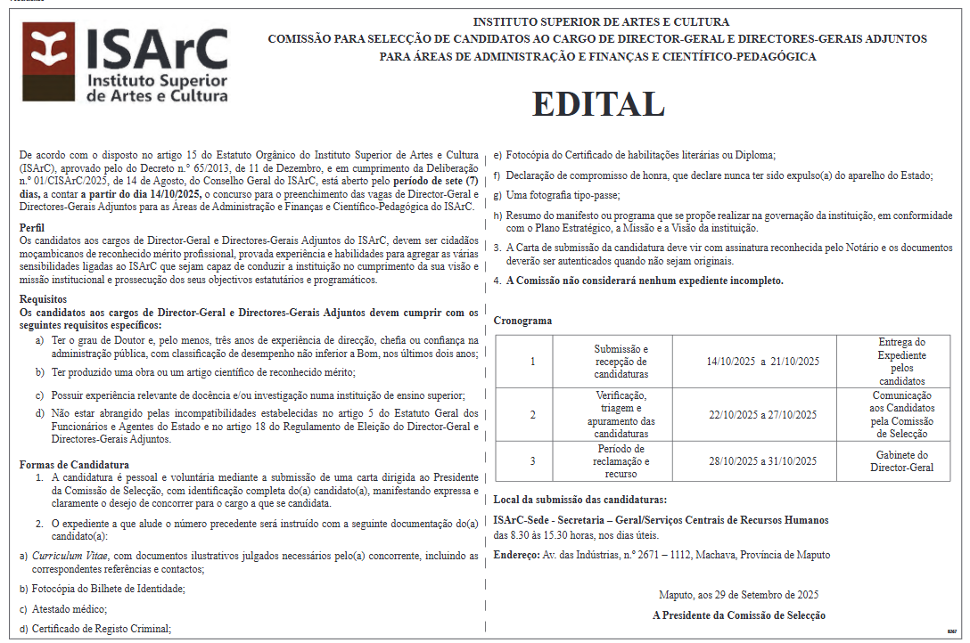 De acordo com o disposto no artigo 15 do Estatuto Organico do Instituto Superior de Artes e Cultura (ISArC), aprovado pelo do Decreto n.° 65/2013, de 11 de Dezembro, e em cumprimento da Deliberação n.° 01/CISArC/2025, de 14 de Agosto, do Conselho Geral do ISArC, esta aberto pelo periodo de sete (7) dias, a contar a partir do dia 14/10/2025, o concurso para o preenchimento das vagas de Director-Geral e Directores-Gerais Adjuntos para as Áreas de Administração e Finanças e Cientifico-Pedagógica do ISArC.