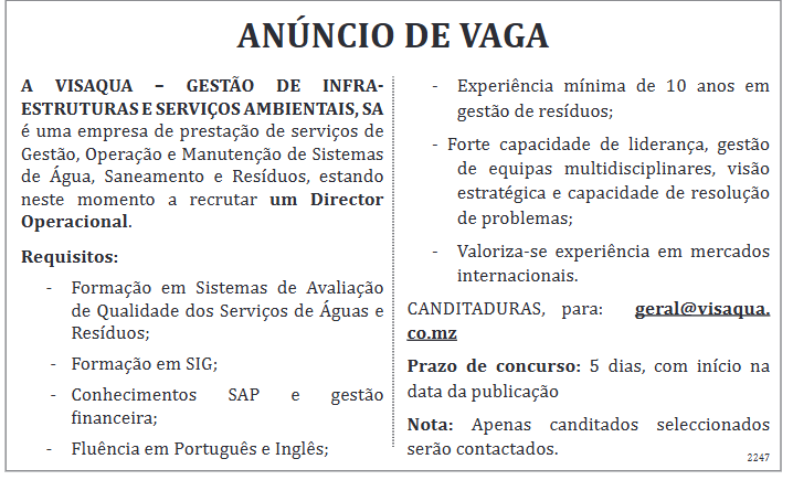 A VISAQUA – GESTÃO DE INFRAESTRUTURAS E SERVIÇOS AMBIENTAIS, SA é uma empresa de prestação de serviços de Gestão, Operação e Manutenção de Sistemas de Água, Saneamento e Resíduos, estando neste momento a recrutar um Director Operacional.