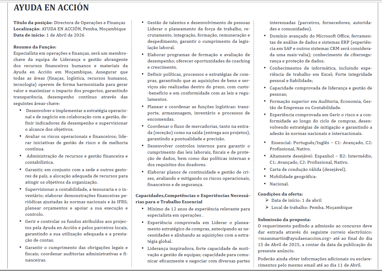 Especialísta em operações e finanças, será um membro-chave da equipa de Liderança e gestão abrangente dos recursos financeiros humanos e materiais da Ayuda en Acción em Moçambique, Assegurar que todas as áreas (finaças, logística, recursos humanos, tecnologia) operem de forma harmonizada para gerar valor e maximizar o impacto dos progectos, garantindo transparência, desempenho contínuo através das seguintes áreas-chave: