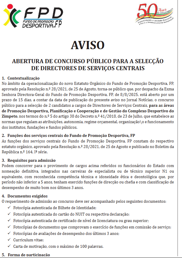 No âmbito da operacionalização do novo Estatuto Orgânico do Fundo de Promoção Desportiva, FP, aprovado pela Resolução n.º 28/2021, de 25 de Agosto, torna-se público que, por despacho da Exma Senhora Directora-Geral do Fundo de Promoção Desportiva, FP, de 8/8/2025, está aberto por um prazo de 15 dias, a contar da data de publicação do presente aviso no Jornal Notícias, o concurso público para a seleção de 2 candidatos a cargos de Directores de Serviços Centrais, para as áreas de Promoção Desportiva, Planificação e Cooperação e de Gestão do Complexo Desportivo do Zimpeto, nos termos do n.º 5 do artigo 38 do Decreto n.º 41/2018, de 23 de Julho, que estabelece as normas que regulam as atribuições, autonomia, regime orçamental, organização\o e funcionamento dos institutos, fundações e fundos públicos.
