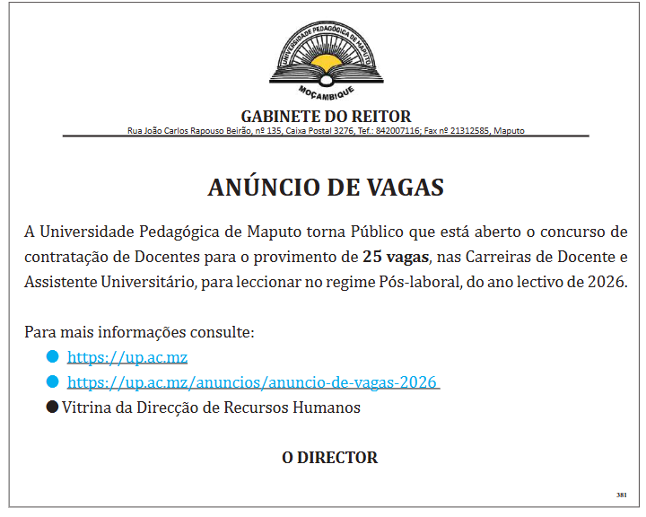 Anúncio de vagas por despacho de 04 de Dezembro de 2025, do Magnífico Reitor, nos termos do nº. 2 do artigo 3 do Regulamento do Estatuto Geral dos Funcionários e Agentes do Estado (REGFAE), conjugado com o n.º 2 do artigo 14 e alínea e) do n.º 1 do artigo 31, ambos do Estatuto Geral dos Funcionários e Agentes do Estado (EGFAE), está aberto o concurso para provimento de 25 Vagas na UP-Maputo, no Regime Pós-Laboral, na Carreira de Assistente Universitário, ano lectivo 2026.