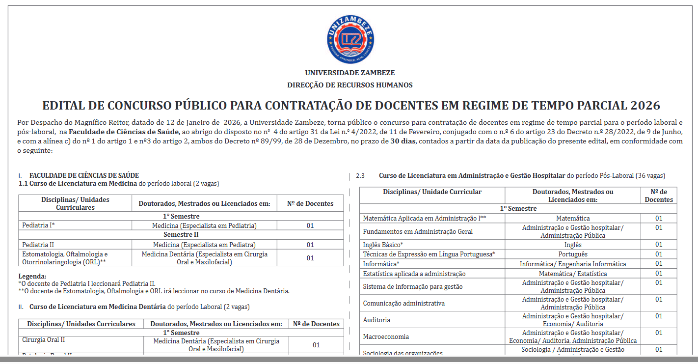Por Despacho do Magnífico Reitor, datado de 12 de Janeiro de 2026, a Universidade Zambeze, torna público o concurso para contratação de docentes em regime de tempo parcial para o período laboral e pós-laboral, na Faculdade de Ciências de Saúde, ao abrigo do disposto no n° 4 do artigo 31 da Lei n.º 4/2022, de 11 de Fevereiro, conjugado com o n.º 6 do artigo 23 do Decreto n.º 28/2022, de 9 de Junho, e com a alínea c) do nº 1 do artigo 1 e nº3 do artigo 2, ambos do Decreto nº 89/99, de 28 de Dezembro, no prazo de 30 dias, contados a partir da data da publicação do presente edital, em conformidade com o seguinte: