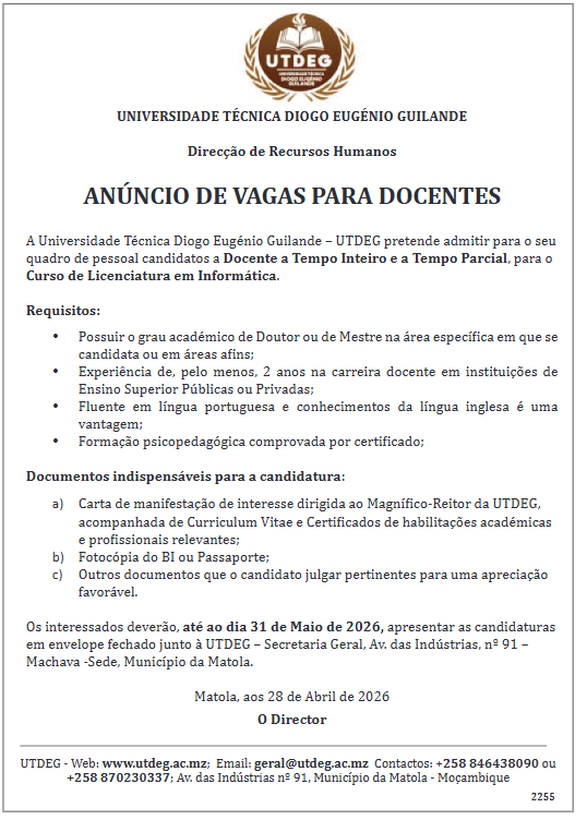 A Universidade Tecnica Diogo Eugenio Guilande – UTDEG pretende admitir para o seu quadro de pessoal candidatos a Docente a Tempo Inteiro e a Tempo Parcial, para o Curso de Licenciatura em Informática.