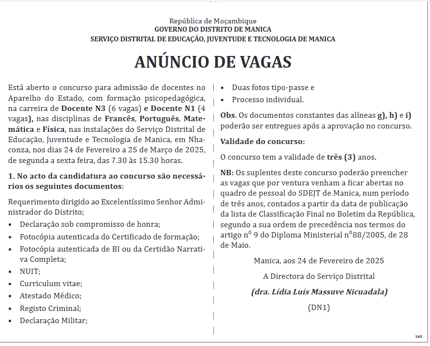 Esta aberto o concurso para admissão de docentes no Aparelho do Estado, com formação psicopedagógica, na carreira de Docente N3 (6 vagas) e Docente N1 (4 vagas), nas disciplinas de Francês, Português, Matemática e Física, nas instalações do Serviço Distrital de Educação, Juventude e Tecnologia de Manica, em Nhaconza, nos dias 24 de Fevereiro a 25 de Março de 2025, de segunda a sexta feira, das 7.30 às 15.30 horas.