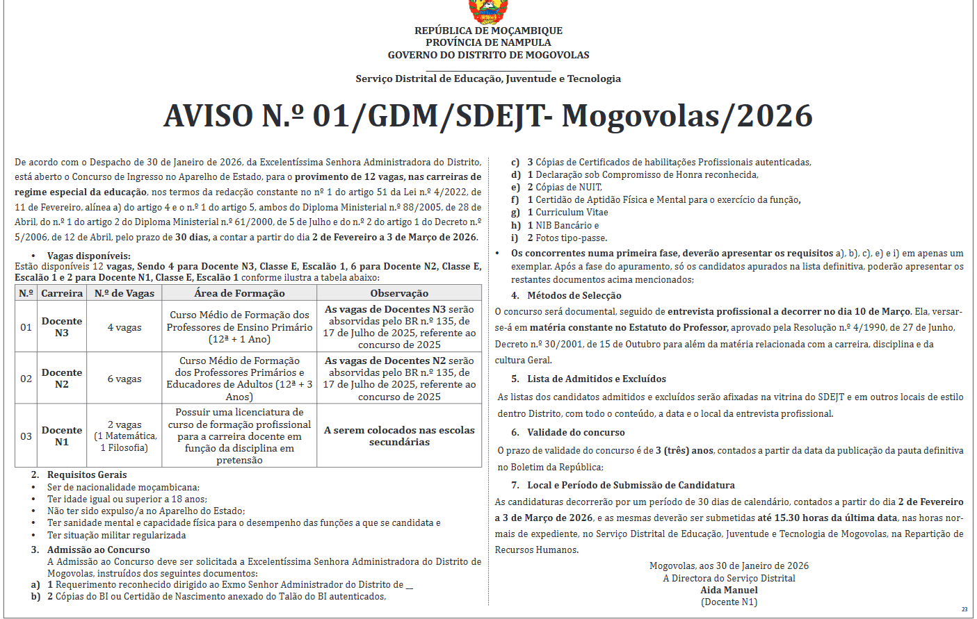 De acordo com o Despacho de 30 de Janeiro de 2026, da Excelentíssima Senhora Administradora do Distrito, esta aberto o Concurso de Ingresso no Aparelho de Estado, para o provimento de 12 vagas, nas carreiras de regime especial da educação, nos termos da redacção constante no nº 1 do artigo 51 da Lei n.º 4/2022, de 11 de Fevereiro, alínea a) do artigo 4 e o n.º 1 do artigo 5, ambos do Diploma Ministerial n.º 88/2005, de 28 de Abril, do n.º 1 do artigo 2 do Diploma Ministerial n.º 61/2000, de 5 de Julho e do n.º 2 do artigo 1 do Decreto n.ºn5/2006, de 12 de Abril, pelo prazo de 30 dias, a contar a partir do dia 2 de Fevereiro a 3 de Março de 2026.