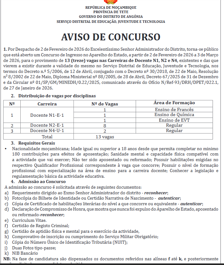 Por Despacho de 2 de Fevereiro de 2026 do Excelentissimo Senhor Administrador do Distrito, torna-se público que esta aberto um Concurso de Ingresso no Aparelho do Estado, a partir de 2 de Fevereiro de 2026 a 3 de Março de 2026, para o provimento de 13 (treze) vagas nas Carreiras de Docente N1, N2 e N4, existentes e das que vierem a existir durante a validade do mesmo no Serviço Distrital de Educação, Juventude e Tecnologia, nos termos do Decreto n.º 5/2006, de 12 de Abril, conjugado com o Decreto nº 30/2018, de 22 de Maio, Resolução n° 8/2002 de 22 de Maio, Diploma Ministerial nº 88/2005, de 28 de Abril, Decreto 67/2025 de 31 de Dezembro e da Circular nº 01/SP/GM/MINEDH/0.22/2025, comunicado através do Ofício N/Ref-93/DRH/DPET/022.1, de 27 de Janeiro de 2026.