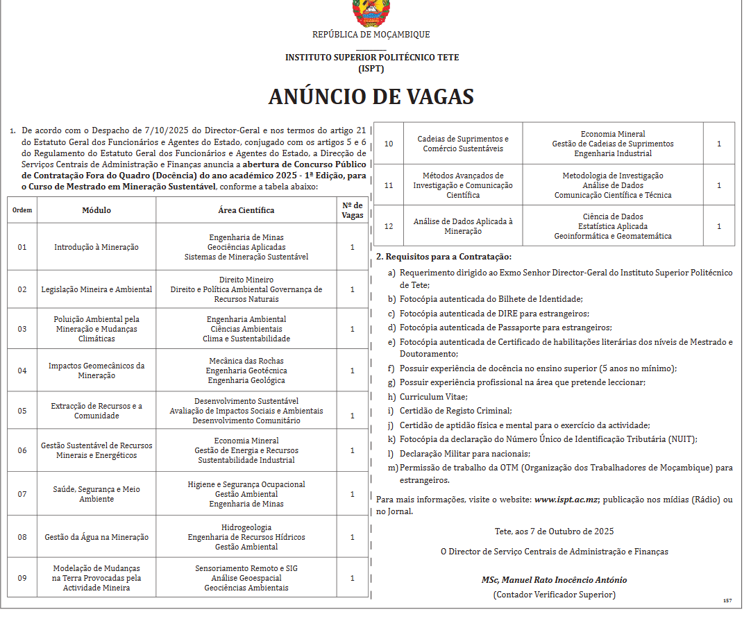 De acordo com o Despacho de 7/10/2025 do Director-Geral e nos termos do artigo 21 do Estatuto Geral dos Funcionários e Agentes do Estado, conjugado com os artigos 5 e 6 do Regulamento do Estatuto Geral dos Funcionários e Agentes do Estado, a Direcção de Serviços Centrais de Administração e Finanças anuncia a abertura de Concurso Publico de Contratação Fora do Quadro (Docência) do ano académico 2025 – 1ª Edição, para o Curso de Mestrado em Mineração Sustentável, conforme a tabela abaixo: