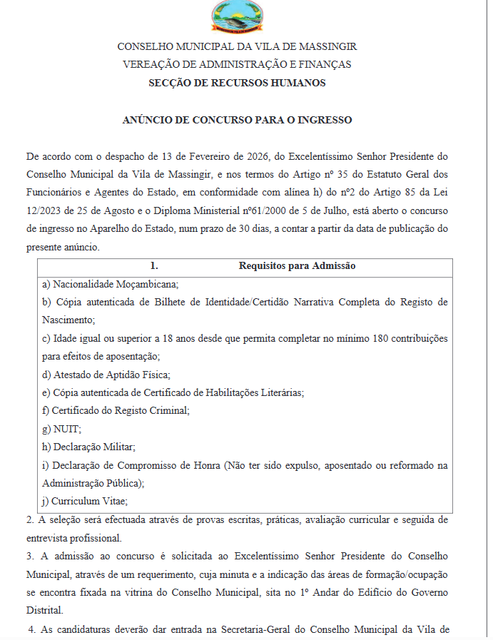 De acordo com o despacho de 13 de Fevereiro de 2026, do Excelentíssimo Senhor Presidente do Conselho Municipal da Vila de Massingir, e nos termos do Artigo n° 35 do Estatuto Geral dos Funcionários e Agentes do Estado, em conformidade com alínea h) do n°2 do Artigo 85 da Lei 12/2023 de 25 de Agosto e o Diploma Ministerial n°61/2000 de 5 de Julho, está aberto o concurso de ingresso no Aparelho do Estado, num prazo de 30 dias, a contar a partir da data de publicação do presente anúncio.