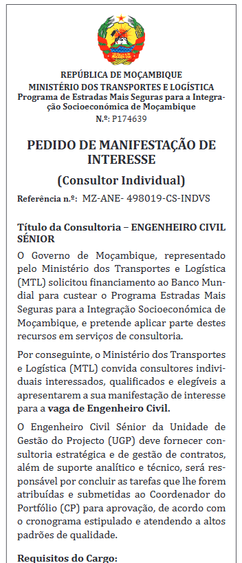Por conseguinte, o Ministério dos Transportes e Logística (MTL) convida consultores individuais interessados, qualificados e elegíveis a apresentarem a sua manifestação de interesse para a vaga de Engenheiro Civil.