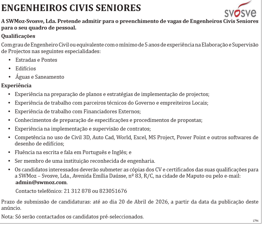 A SWMoz-Svosve, Lda. Pretende admitir para o preenchimento de vagas de Engenheiros Civis Seniores para o seu quadro de pessoal.