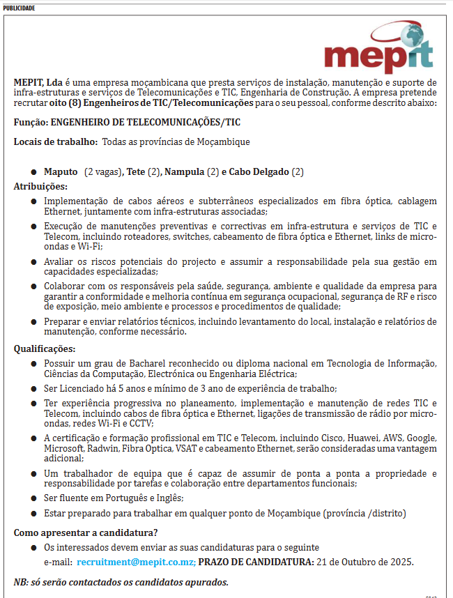 MEPIT, Lda é uma empresa moçambicana que presta serviços de instalação, manutenção e suporte de infra-estruturas e serviços de Telecomunicações e TIC, Engenharia de Construção. A empresa pretende recrutar oito (8) Engenheiros de TIC/Telecomunicações para o seu pessoal, conforme descrito abaixo: