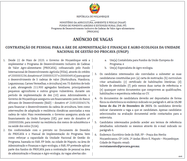 Em conformidade com o previsto no Documento de Desenho do PROCAVA e o Manual de Implementação do Programa, bem como reforçar a capacidade da Unidade Nacional de Gestão do Programa, baseada no FAR, FP Sede, na cidade de Maputo, na área de Administração e Finanças e Agro-ecologia, o FAR, FP pretende aplicar parte dos fundos do PROCAVA para a contratação de pessoal na área de administração e finanças e Agro-ecologia. As vagas abertas são: