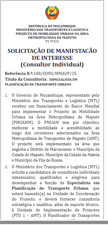O Ministério dos Transportes e Logística (MTL) solicita a candidatura de consultores individuais interessados, qualificados e elegíveis para desempenhar a função de Especialista em Planificação de Transporte Urbano, que estará baseado(a) na Unidade de Coordenação do Projecto, e devera fornecer consultoria estratégica e analítica, além de suporte técnico, à Unidade de Implementação de Projectos (PTU 1 – AMT). O Planificador de Transportes desenvolverá a capacidade da AMT para planejar rotas, serviços e horários tanto para serviços BRT quanto para serviços convencionais. Ele/ Ela elaborara o plano de serviço inicial para as rotas BRT e seus respetivos alimentadores, Monitorando e ajustando-os conforme necessário, de acordo com a demanda real. À medida que o sistema BRT se estabilizar, ele/ela estenderá sua actuação para rotas convencionais e, por fim, para serviços informais de táxi colectivo (Chapa), de modo a desenvolver uma rede multimodal integrada.