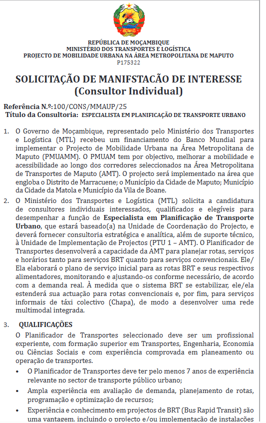 O Ministério dos Transportes e Logística (MTL) solicita a candidatura de consultores individuais interessados, qualificados e elegíveis para desempenhar a função de Especialista em Planificação de Transporte