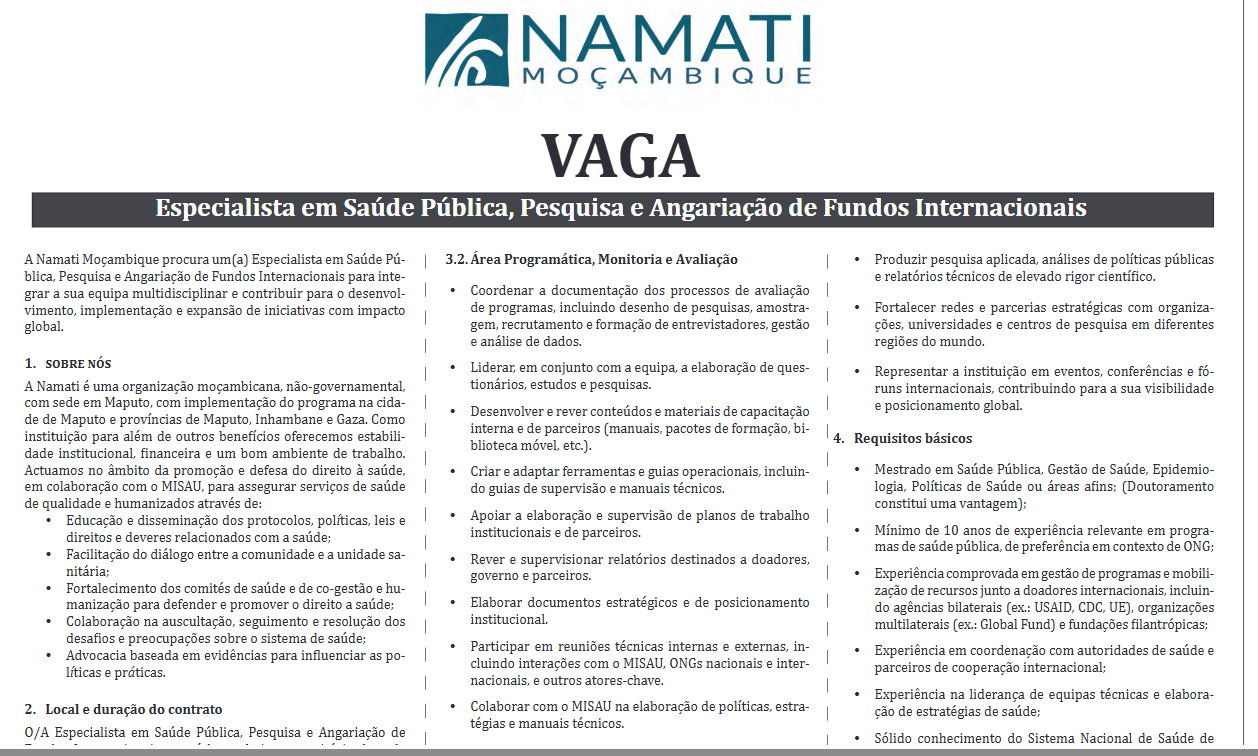 A Namati Moçambique procura um(a) Especialista em Saúde Pública, Pesquisa e Angariação de Fundos Internacionais para integrar a sua equipa multidisciplinar e contribuir para o desenvolvimento, implementação e expansão de iniciativas com impacto global.