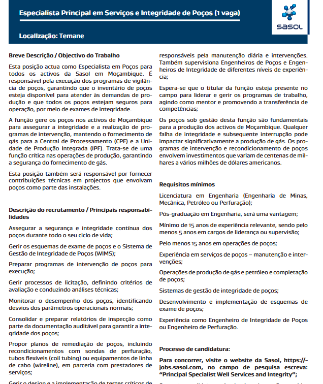 todos os activos da Sasol em Moçambique. E responsável pela execução dos programas de vigilância de poços, garantindo que o inventario de poços esteja disponível para atender as demandas de produção e que todos os poços estejam seguros para operação, por meio de exames de integridade.