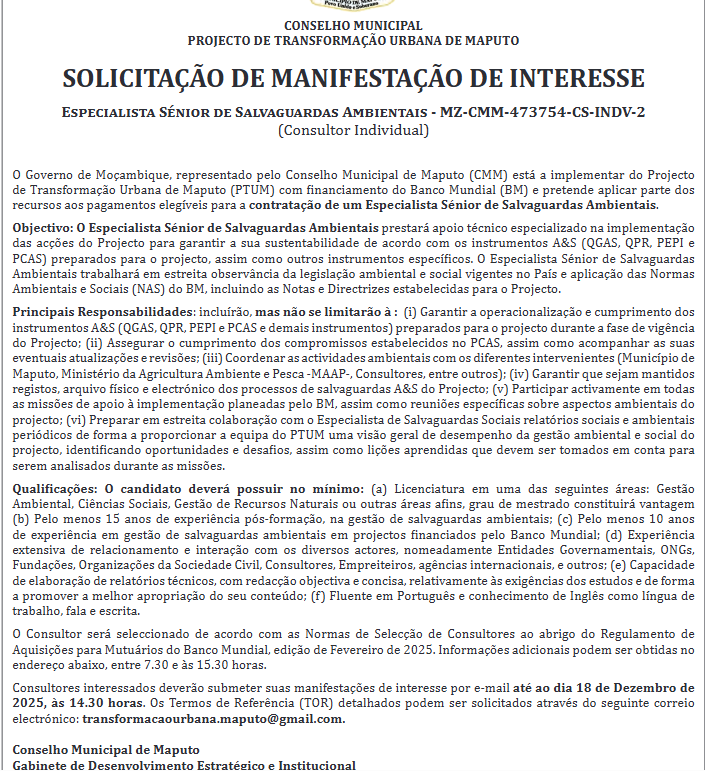 O Governo de Moçambique, representado pelo Conselho Municipal de Maputo (CMM) esta a implementar do Projecto de Transformação Urbana de Maputo (PTUM) com financiamento do Banco Mundial (BM) e pretende aplicar parte dos recursos aos pagamentos elegíveis para a contratação de um Especialista Sénior de Salvaguardas Ambientais.
