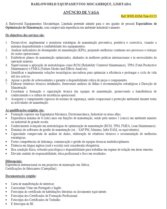 As candidaturas (carta de motivação e curriculum vitae) deverão ser enviada ate ao dia 05 de Novembro de 2025 para o seguinte endereço eletrónico E-mail: mozambiquereeruitment@barloworld-cquipmeni.com