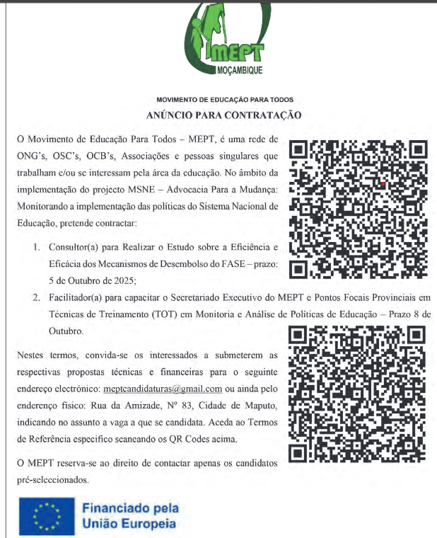 - Facilitador(a) para capacitar o Secretariado Executivo do MEPT e Pontos Focais Provinciais em Técnicas de Treinamento (TOT) em Monitoria e Análise de Políticas de Educação – Prazo 8 de Outubro.