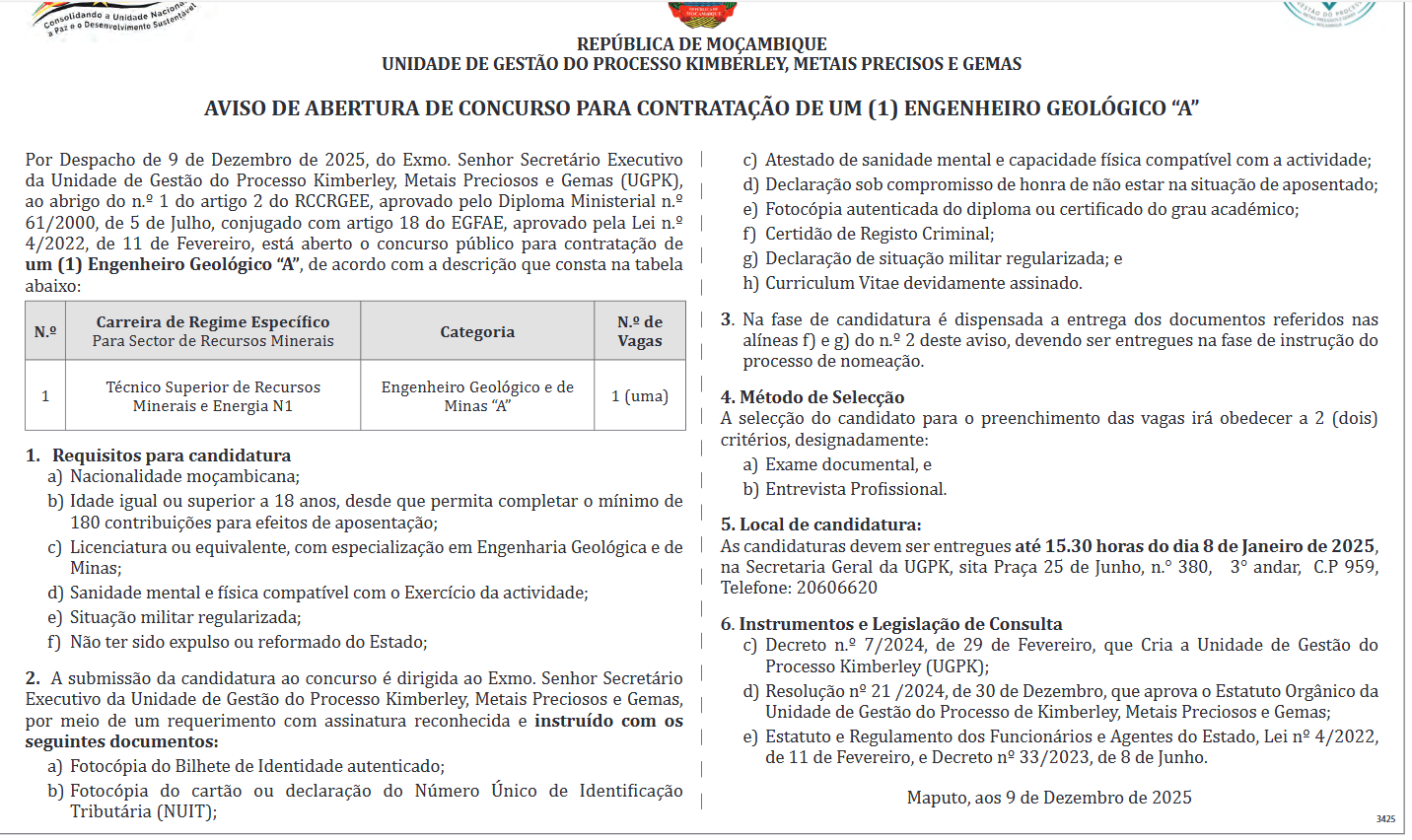1. Por Despacho de 9 de Dezembro de 2025, do Exmo. Senhor Secretário Executivo da Unidade de Gestão do Processo Kimberley, Metais Preciosos e Gemas (UGPK), ao abrigo do n.º 1 do artigo 2 do RCCRGEE, aprovado pelo Diploma Ministerial n.º 61/2000, de 5 de Julho, conjugado com artigo 18 do EGFAE, aprovado pela Lei n.º 4/2022, de 11 de Fevereiro, está aberto o concurso público para contratação de um (1) Engenheiro Geológico “A”, de acordo com a descrição que consta na tabela abaixo: