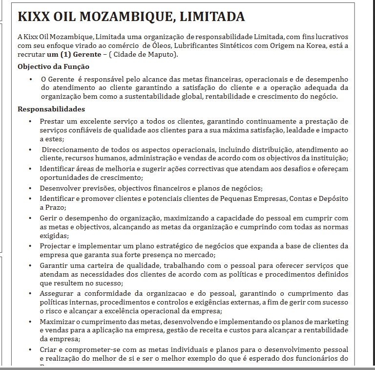 A Kixx Oil Mozambique, Limitada uma organização de responsabilidade Limitada, com fins lucrativos com seu enfoque virado ao comercio de Óleos, Lubrificantes Sintéticos com Origem na Korea, está a recrutar um (1) Gerente – (Cidade de Maputo).