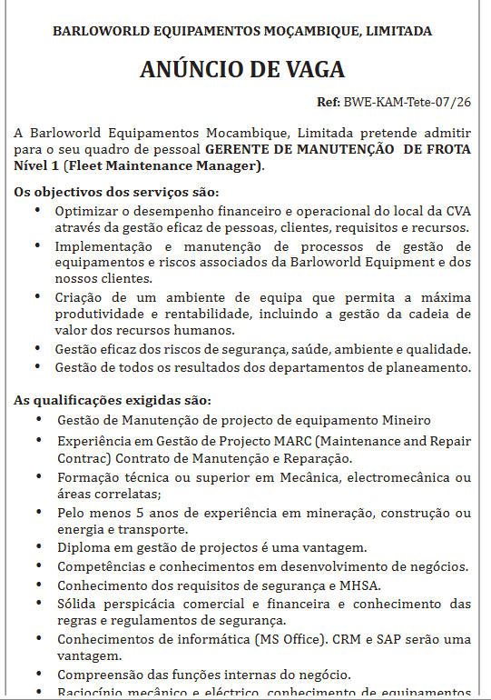 Candidaturas: envio de carta de manifestação de interesse, CV (em Português e Inglês) e documentos comprovativos para mozambiquerecruitment@barloworld-equipment.com até 30 de Abril de 2026.