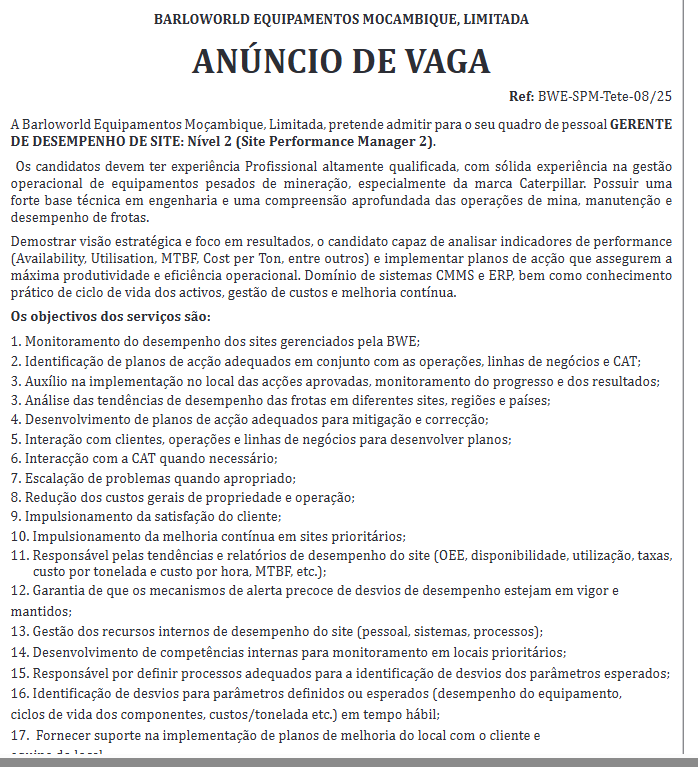 A Barloworld Equipamentos Moçambique, limitada, pretende admitir para o seu quadro de pessoal GERENTEE DESEMPENHO DE SITE: