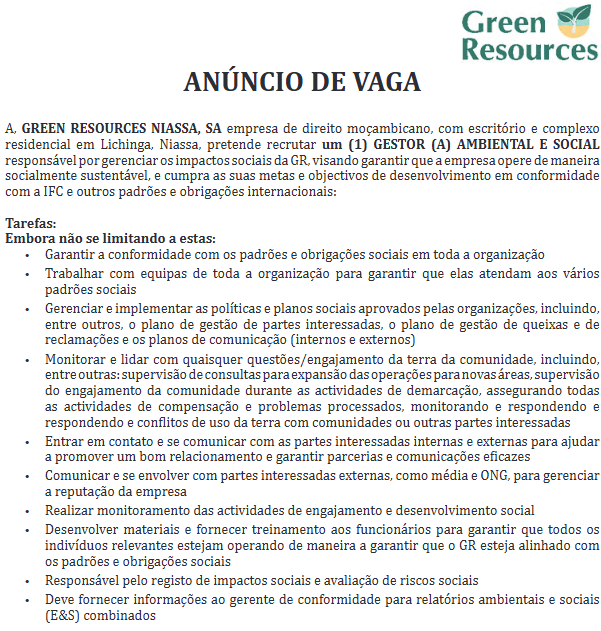 - GREEN RESOURCES NIASSA, SA empresa de direito moçambicano, com escritório e complexo residencial em Lichinga, Niassa, pretende recrutar um (1) GESTOR (A) AMBIENTAL E SOCIAL responsável por gerenciar os impactos sociais da GR, visando garantir que a empresa opere de maneira socialmente sustentável, e cumpra as suas metas e objectivos de desenvolvimento em conformidade com a IFC e outros padrões e obrigações internacionais: