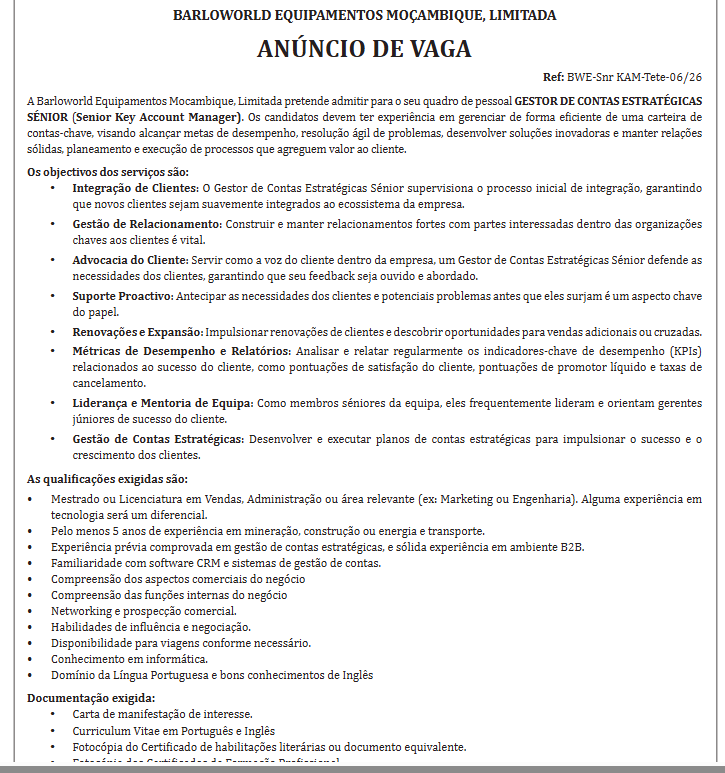 A Barloworld Equipamentos Moçambique, Limitada pretende admitir para o seu quadro de pessoal Gestor De Contas Estratégicas Sénior (Sénior Key Account Manager). Os candidatos devem ter experiência em gerenciar de forma eficiente de uma carteira descontas-chave, visando alcançar metas de desempenho, resolução ágil de problemas, desenvolver soluções inovadoras e manter relações sólidas, planeamento e execução de processos que agreguem valor ao cliente.