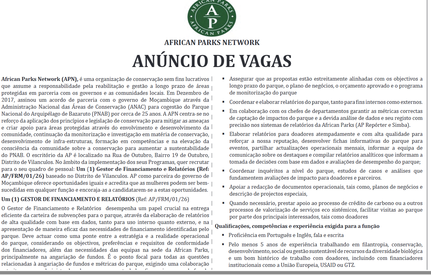 Nacional do Arquipélago de Bazaruto (PNAB) por cerca de 25 anos. A APN centra-se no reforço da aplicação dos princípios e legislação de conservação para mitigar as ameaças e criar apoio para áreas protegidas através do envolvimento e desenvolvimento da comunidade, continuação da monitorização e investigação em matéria de conservação, desenvolvimento de infraestruturas, formação em competências e na elevação da consciência da comunidade sobre a conservação para aumentar a sustentabilidade do PNAB. O escritório da AP é localizado na Rua de Outubro, Bairro 19 de Outubro, I Distrito de Vilanculos. No âmbito da implementação dos seus Programas, quer recrutar para o seu quadro de pessoal: Um (1) Gestor de Financiamento e Relatórios (Ref: AP/FRM/01/26) baseado no Distrito de Vilanculos. AP como parceira do governo de Moçambique oferece oportunidades iguais e acredita que as mulheres podem ser bem- |sucedidas em qualquer função e encoraja-as a candidatarem-se a estas oportunidades.