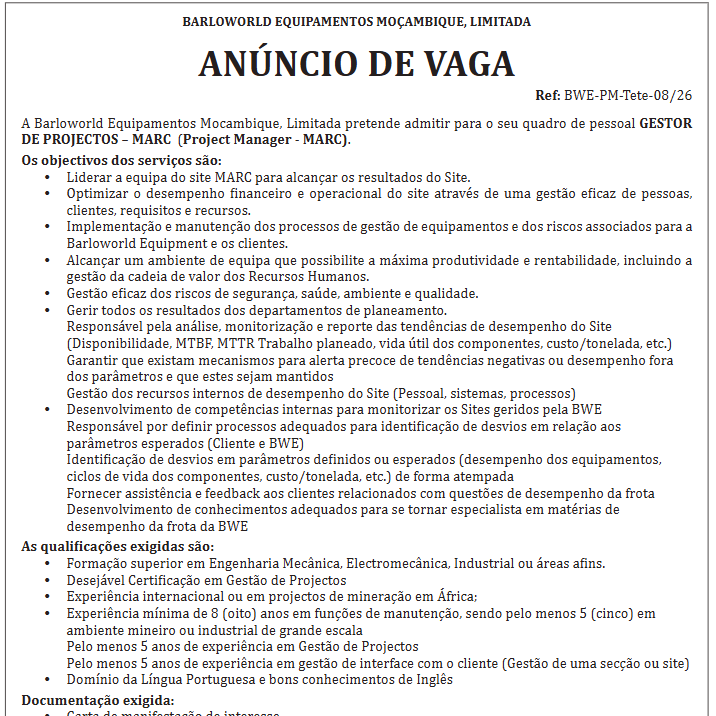 As candidaturas (carta de motivação e curriculum vitae) deverão ser enviada até ao dia 10 de Fevereiro de 2026 para seguinte endereço eletrónico E-mail: mozambiquerecruitment@barloworld-equipment.com