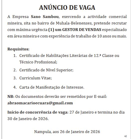 A Empresa Sano Sambou, exercendo a actividade comercial mineira, sita no bairro de Muhala-Belenenses, pretende recrutar com máxima urgência (1) um Gestor De Vendas especializado em área mineira e com experiência de trabalho de 10 anos ou mais.