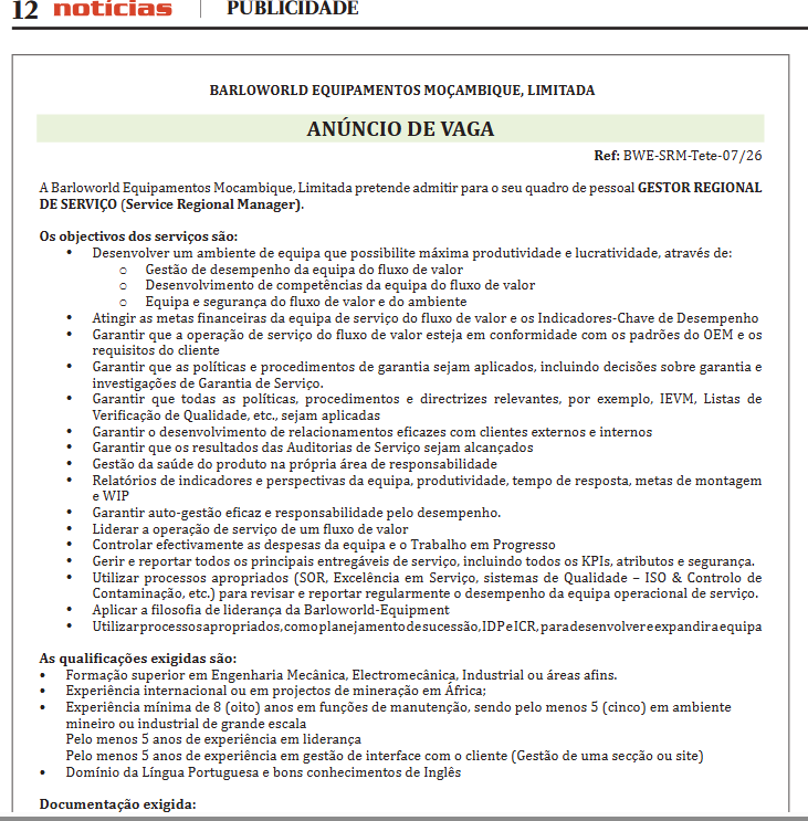 As candidaturas (carta de motivação e curriculum vitae) deverão ser enviada ate ao dia 10 de Fevereiro de 2026 para o seguinte endereço eletrónico E-mail: mozambiquerecruitment@barloworld-equipment.com
