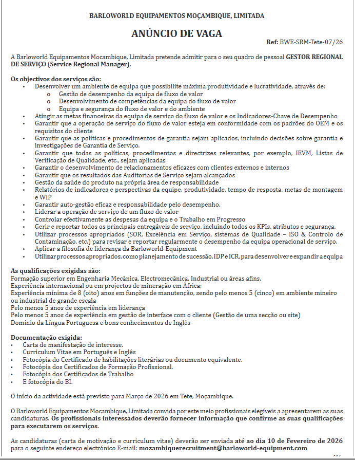 As candidaturas (carta de motivação e curriculum vitae) deverão ser enviadas até ao dia 10 de Fevereiro de 2026 para o seguinte endereço eletrónico E-mail: mozambiquerecruitment@barloworld-equipment.com