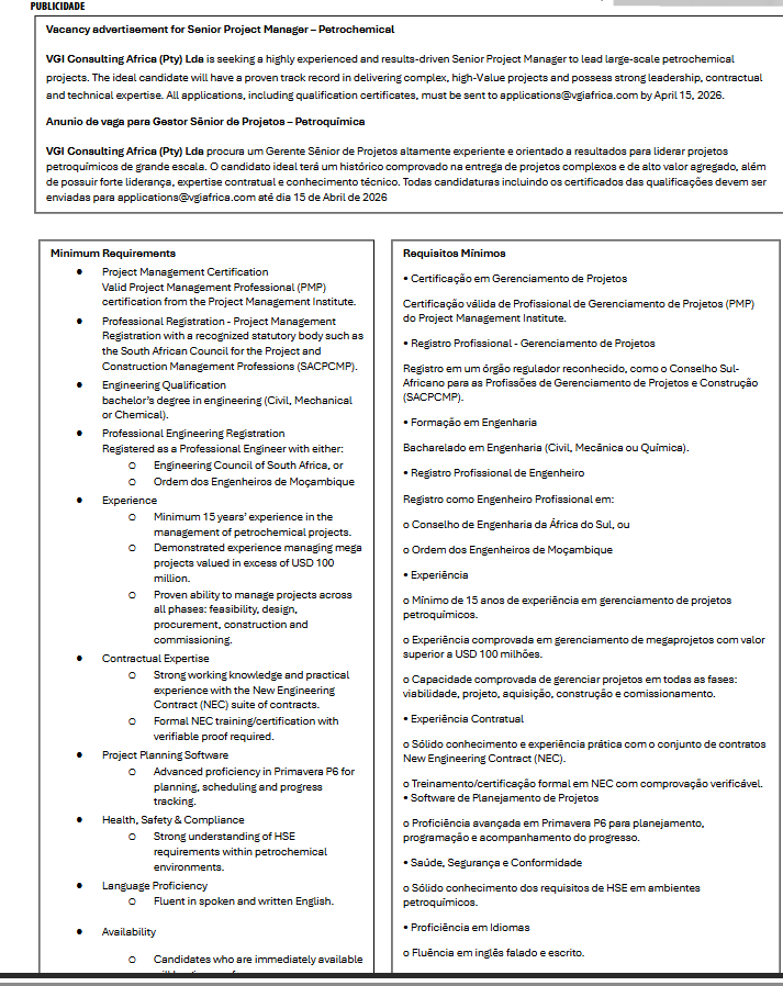 VGI Consulting Africa (Pty) Lda procura um Gerente Sênior de Projetos altamente experiente e orientado a resultados para liderar projetos petroquímicos de grande escala. O candidato ideal terá um histórico comprovado na entrega de projetos complexos e de alto valor agregado, além de possuir forte liderança, expertise contratual e conhecimento técnico.