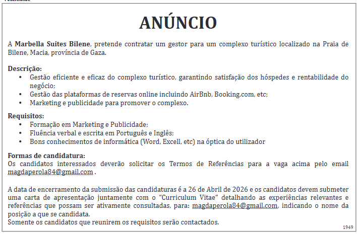 A Marbella Suites Bilene, pretende contratar um gestor para um complexo turístico localizado na Praia de Bilene, Macia, província de Gaza.