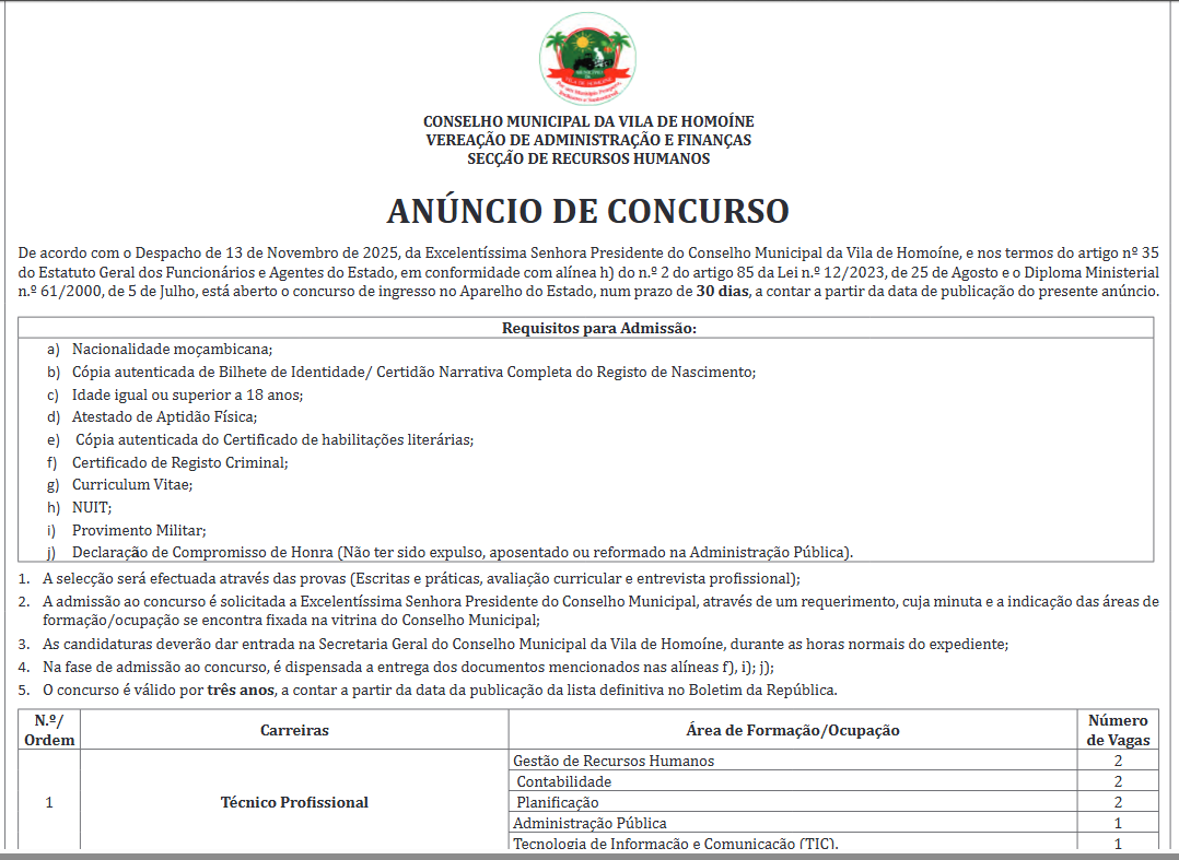 De acordo com o Despacho de 13 de Novembro de 2025, da Excelentíssima Senhora Presidente do Conselho Municipal da Vila de Homoíne, e nos termos do artigo nº 35 do Estatuto Geral dos Funcionários e Agentes do Estado, em conformidade com alínea h) do n.º 2 do artigo 85 da Lei n.º 12/2023, de 25 de Agosto e o Diploma Ministerial n.º 61/2000, de 5 de Julho, está aberto o concurso de ingresso no Aparelho do Estado, num prazo de 30 dias, a contar a partir da data de publicação do presente anúncio.