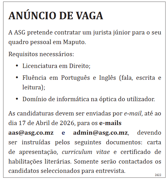 A ASG pretende contratar um jurista Júnior para o seu quadro pessoal em Maputo.