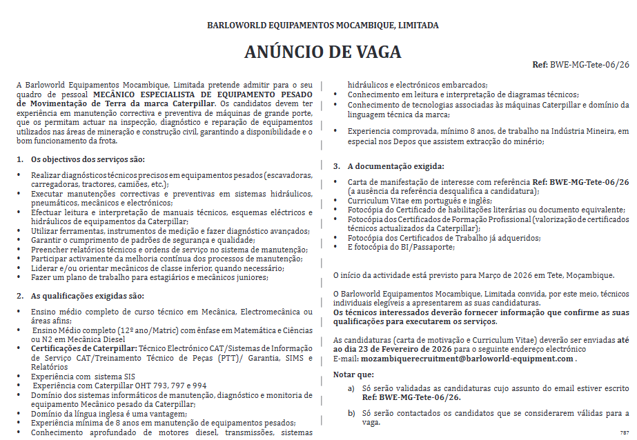 A Barloworld Equipamentos Moçambique, Limitada pretende admitir para o seu quadro de pessoal MECANICO ESPECIALISTA DE EQUIPAMENTO PESADO de Movimentação de Terra da marca Caterpillar. Os candidatos devem ter experiência em manutenção corretiva e preventiva de máquinas de grande porte, que os permitam actuar na inspeção, diagnostico e reparação de equipamentos utilizados nas áreas de mineração e construção civil, garantindo a disponibilidade e o bom funcionamento da frota.