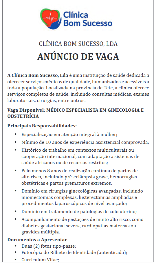 Os candidatos interessados deverão submeter as suas candidaturas nas instalações da Clínica Bom Sucesso, localizadas na cidade de Tete, Estrada Número 7, Bairro Chingodzi, em frente à Bomba Puma.