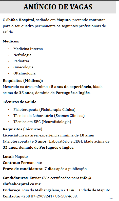 O Shifaa Hospital, sediado em Maputo, pretende contratar para o seu quadro permanente os seguintes profissionais de saúde:
