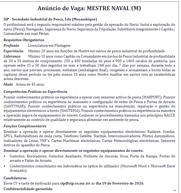 Experiência: Mínimo 20 anos em funções de Mestre em navios de pesca industrial de profundidade.