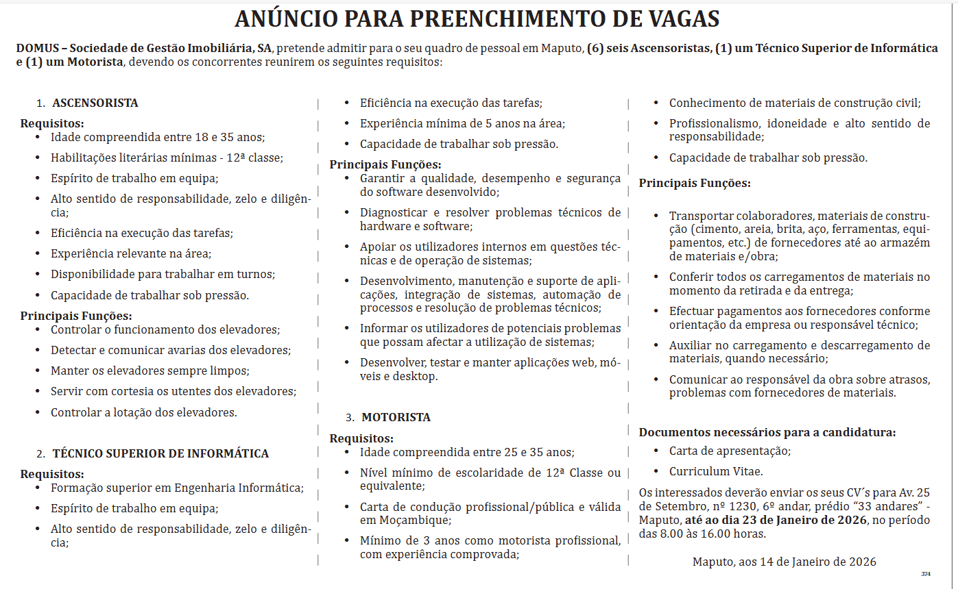 DOMUS – Sociedade de Gestão Imobiliária, SA, pretende admitir para o seu quadro de pessoal em Maputo, (6) seis Ascensoristas, (1) um Técnico Superior de Informática e (1) um Motorista, devendo os concorrentes reunirem os seguintes requisitos: