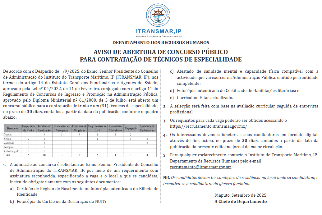 De acordo com o Despacho de /9/2025, do Exmo. Senhor Presidente do Conselho de Administração do Instituto do Transporte Marítimo, IP (ITRANSMAR, IP), nos termos do artigo 14 do Estatuto Geral dos Funcionários e Agentes do Estado, aprovado pela Lei nº 04/2022, de 11 de Fevereiro, conjugado com o artigo 11 do Regulamento de Concursos de Ingresso e Promoção na Administração Pública, aprovado pelo Diploma Ministerial nº 61/2000, de 5 de Julho, está aberto um concurso público para a contratação de trinta e um (31) técnicos de especialidade, no prazo de 30 dias, contados a partir da data da publicação, conforme o quadro abaixo: