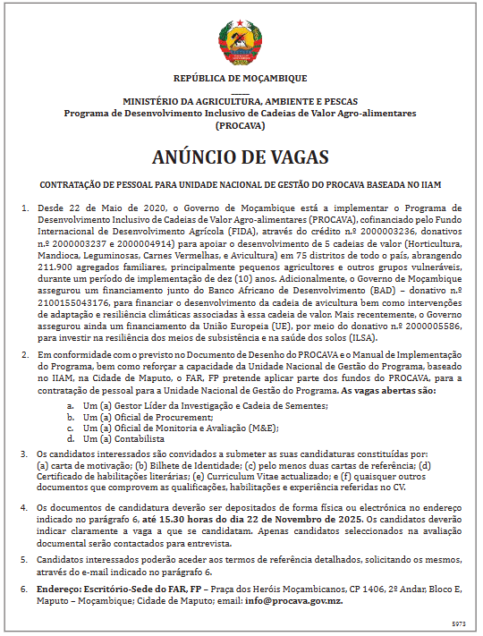 Em conformidade com o previsto no Documento de Desenho do PROCAVA e o Manual de Implementação do Programa, bem como reforçar a capacidade da Unidade Nacional de Gestão do Programa, baseado no IIAM, na Cidade de Maputo, o FAR, FP pretende aplicar parte dos fundos do PROCAVA, para contratação de pessoal para a Unidade Nacional de Gestão do Programa. As vagas abertas sao: