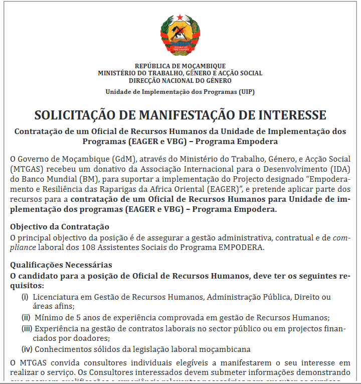 Contratação de um Oficial de Recursos Humanos da Unidade de Implementação dos Programas (EAGER e VBG) – Programa Empodera O Governo de Moçambique (GdM), através do Ministério do Trabalho, Género, e Acção Social (MTGAS) recebeu um donativo da Associação Internacional para o Desenvolvimento (IDA) do Banco Mundial (BM), para suportar a implementação do Projecto designado “Empodera- mento e Resiliência das Raparigas da Africa Oriental (EAGER)”, e pretende aplicar parte dos recursos para a contratação de um Oficial de Recursos Humanos para Unidade de im- plementação dos programas (EAGER e VBG) – Programa Empodera.