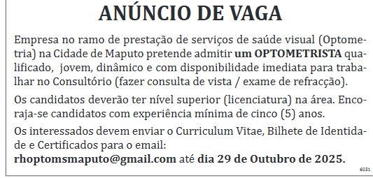 Empresa no ramo de prestação de serviços de saúde visual (Optometria) na Cidade de Maputo pretende admitir um OPTOMETRISTA qualificado, jovem, dinâmico e com disponibilidade imediata para trabalhar no Consultório (fazer consulta de vista / exame de refração).